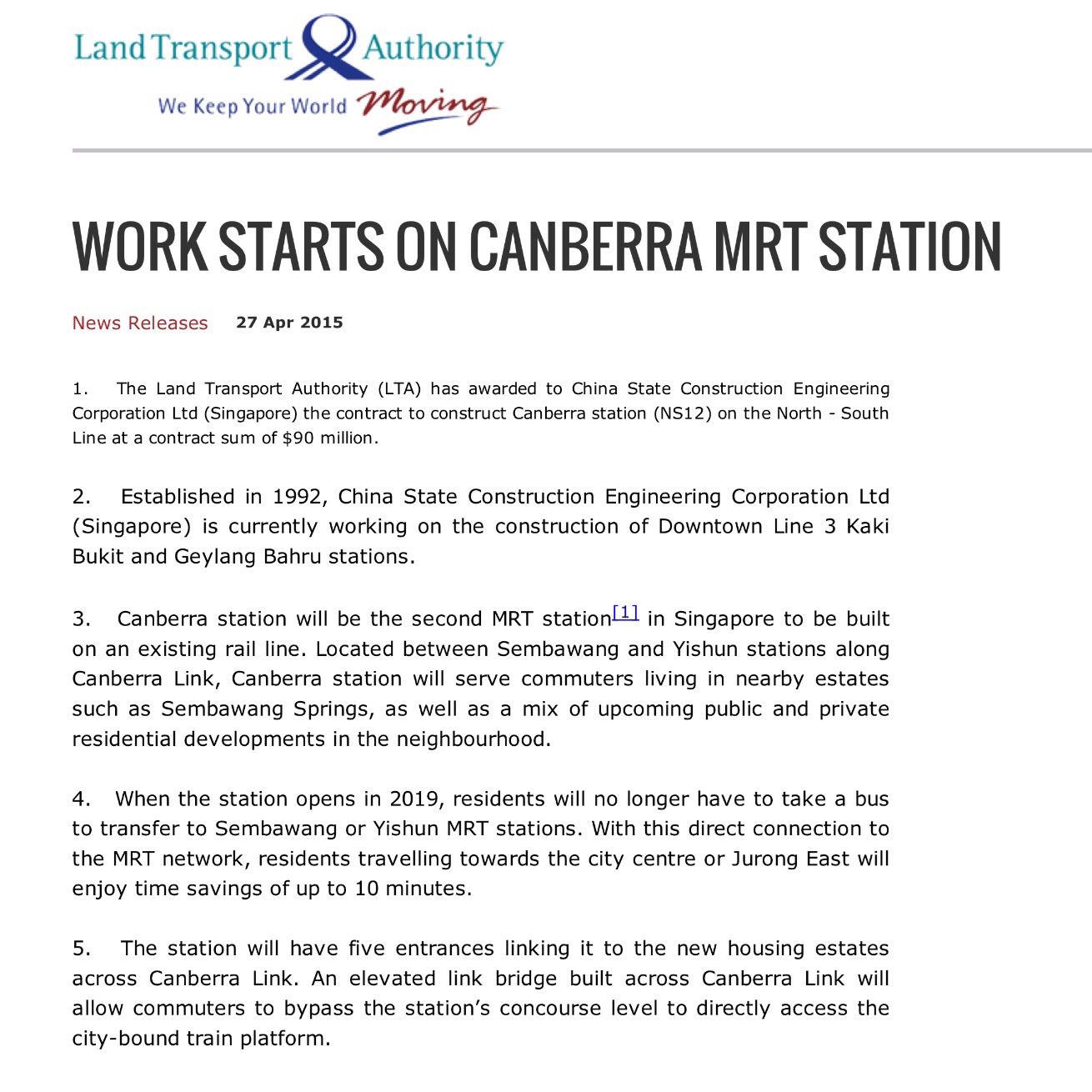 LATEST NEWS ON NEW MRT – CANBERRA STATION (NS12)